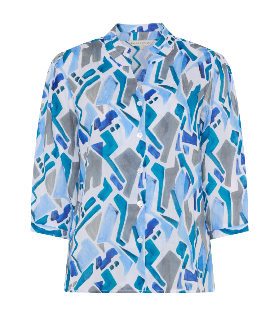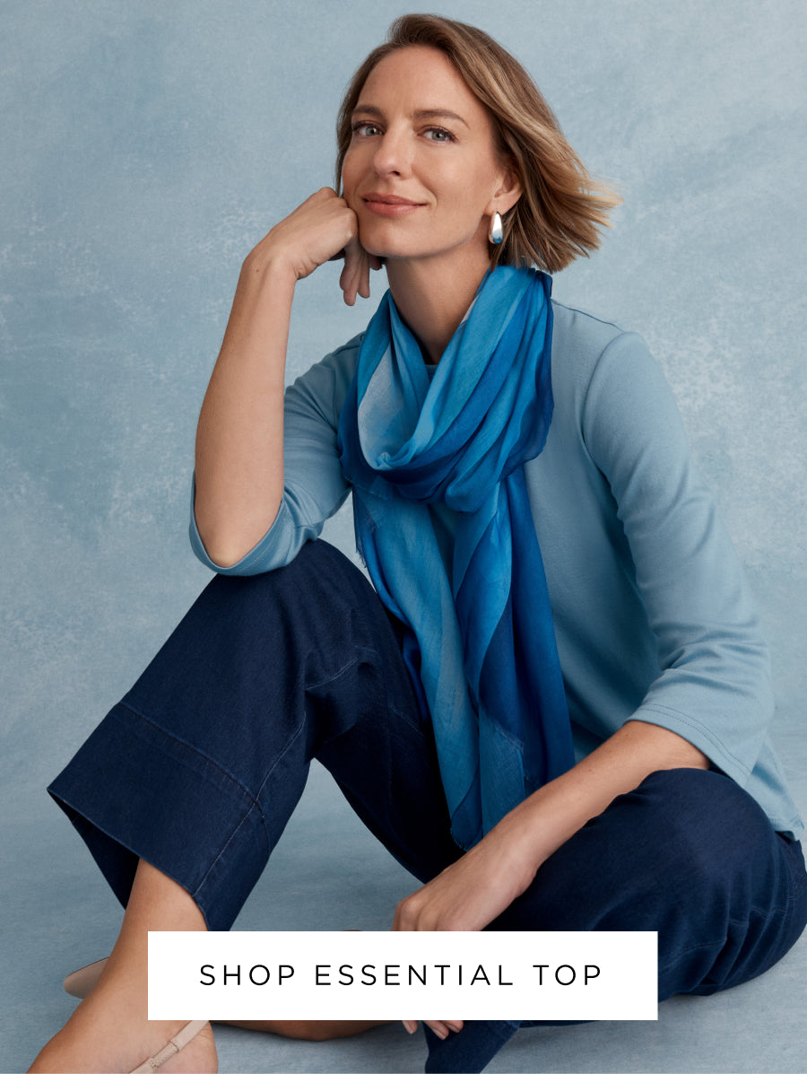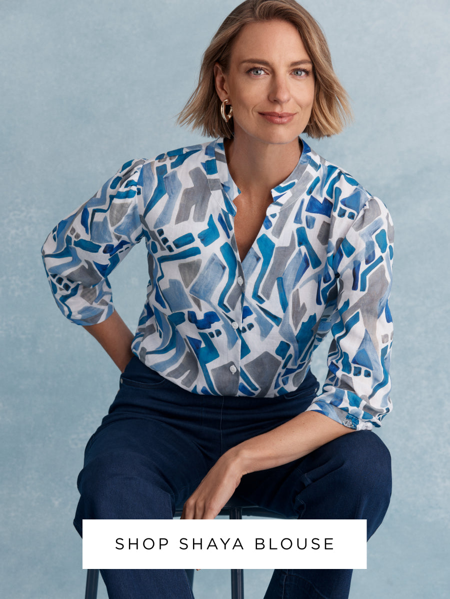 Complemented by Cornsilk blue and Erinite, the range is soft and calming. We think you will love the Shaya blouse in a bold, abstract print, an Essential Top in striking Erinite and a scarf in stunning teals and shades of blue.