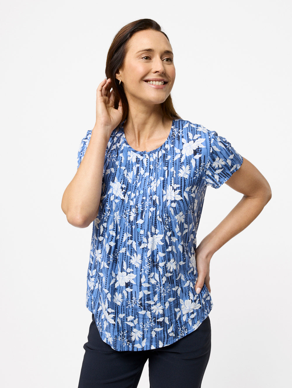 Flowy and feminine, the Allyson Skirt is a versatile piece that moves effortlessly from workday to weekend. Crafted from 100% soft rayon, it drapes beautifully with a relaxed fit that’s both flattering and comfortable. The wide elastic waistband ensures easy pull-on wear, whilst the softly gathered tiers create movement and shape. Designed in a navy and blue floral print with white accents, set against an abstract background of lines and dots, this mid-length skirt blends playful detail with timeless style. Perfect for dressy casual occasions, pair it with a blouse or simple tee for an elevated look.