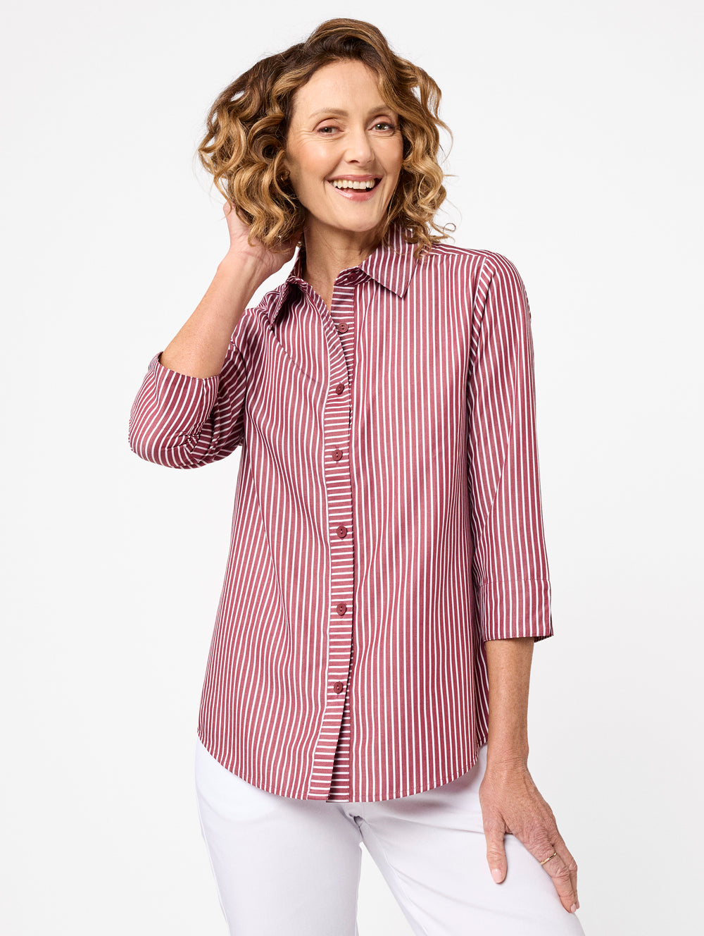 The Janet 3/4 Sleeve Shirt combines everyday comfort with easy-care convenience, making it perfect for work-to-weekend wear. Crafted from a blend of 70% cotton, 26% polyester, and 4% spandex, it offers breathable softness with a hint of stretch, plus minimal ironing for effortless upkeep. The collared design, button-up front, and chest pockets add classic shirt detailing, while the 3/4 sleeves with split cuffs provide a relaxed yet polished look. Featuring a vertical striped pattern in white, blues, green, and orange—aptly named Gelato—this shirt brings a refreshing pop of colour to your wardrobe. Finished with a curved hem and regular fit, it’s a versatile piece that pairs beautifully with tailored pants, skirts, or casual denim.