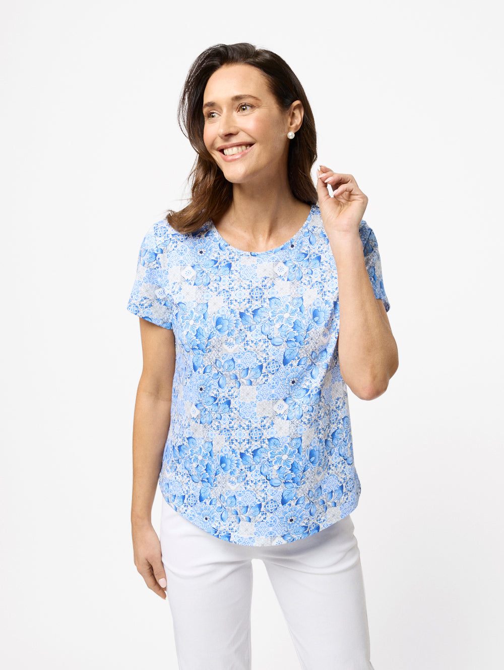 The Tammi Blouse combines soft structure with an easy, relaxed feel. Designed in a mix of blue, white, grey, and black florals with abstract linework, it adds interest while remaining versatile to style with your everyday wardrobe. A round neckline with a gentle V notch frames the face, while pin tuck pleats through the front give shape and detail without bulk. Elasticated cuffs keep the short sleeves neatly in place, and a back yoke with single pleat ensures room to move. Finished in a light, breathable fabric, this blouse is a comfortable choice for days when you want both colour and ease.